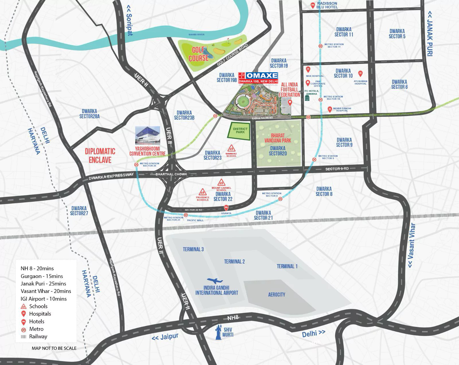 Omaxe is developing a new project called Omaxe Dwarka. It will be ideally situated in Sector 19B, Dwarka, Delhi, across from Bharat Vandna Park, and only a short distance from the IGI Airport, making it the most convenient and easily accessible location.
