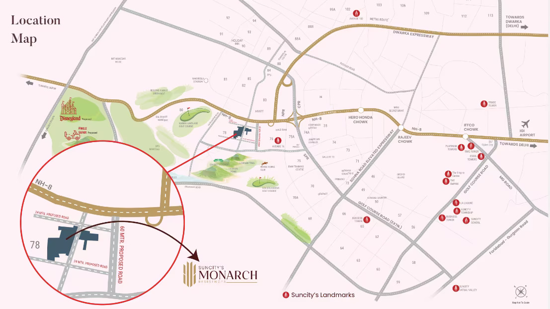 Surrounded by over 93% open green landscapes and offering breathtaking views of the Aravalli Hills, Suncity Monarch Residences delivers a serene and refreshing lifestyle amidst nature. The project features a grand, state-of-the-art clubhouse, beautifully landscaped gardens, and world-class lifestyle amenities that cater to modern family living.
